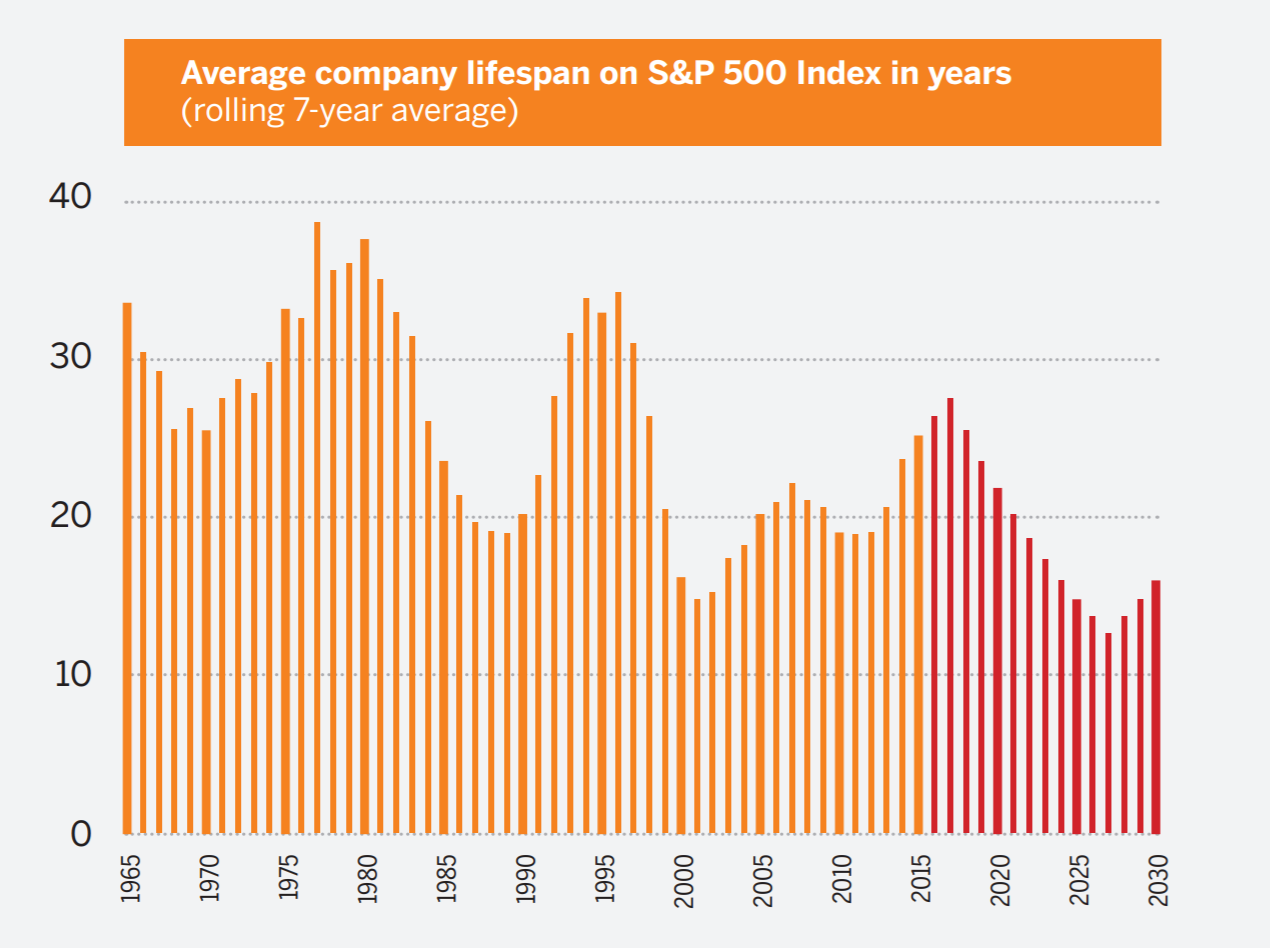 Der Innovationsdruck auf etablierte Firmen steigt ständig: Wie ein Bericht von Innosight zeigt, sank die durchschnittliche Anzahl Jahre einer Firmen im S&P-500-Index von 33 im Jahr 1965 auf 20 im Jahr 1990. Bis 2026 wird ein Rückgang auf 14 Jahre prognostiziert. Wer überleben will, muss (immer schneller) innovieren, – und braucht Innovationskommunikation.